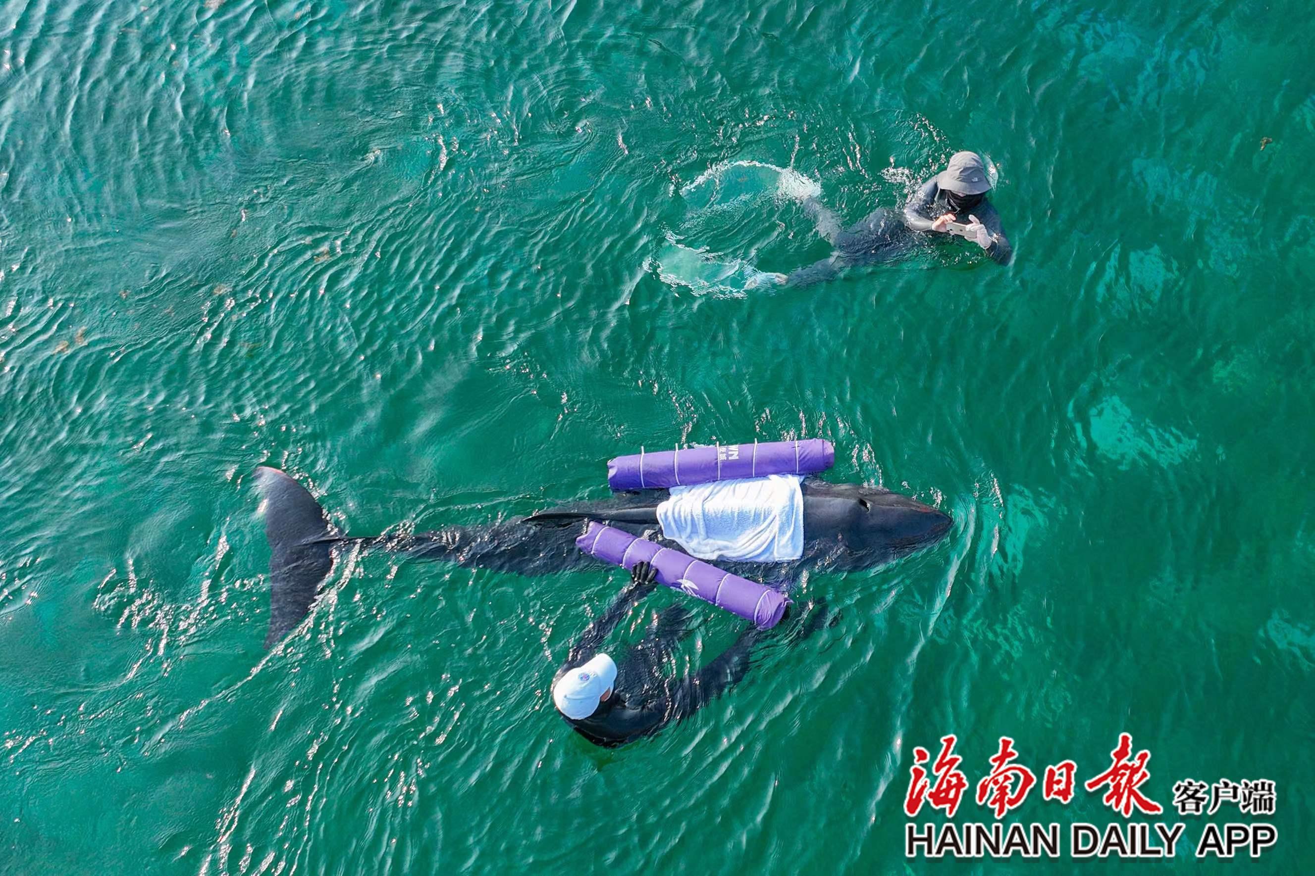 2月15日,一头鲸鱼搁浅三亚崖州区梅联社区海滩。三亚梅联海岸派出所与渔民联合三亚市蓝丝带海洋保护协会、海警、蓝天救援队等多部门救助。