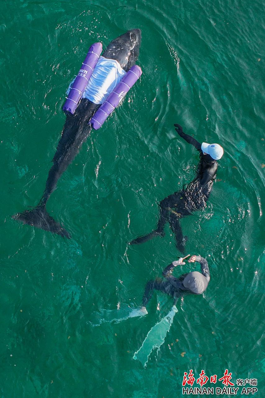 2月16日下午,经过20多小时的医疗救助,该鲸鱼体力有所恢复,在浮漂和潜水员志愿者的帮助下,可以在水中游动。