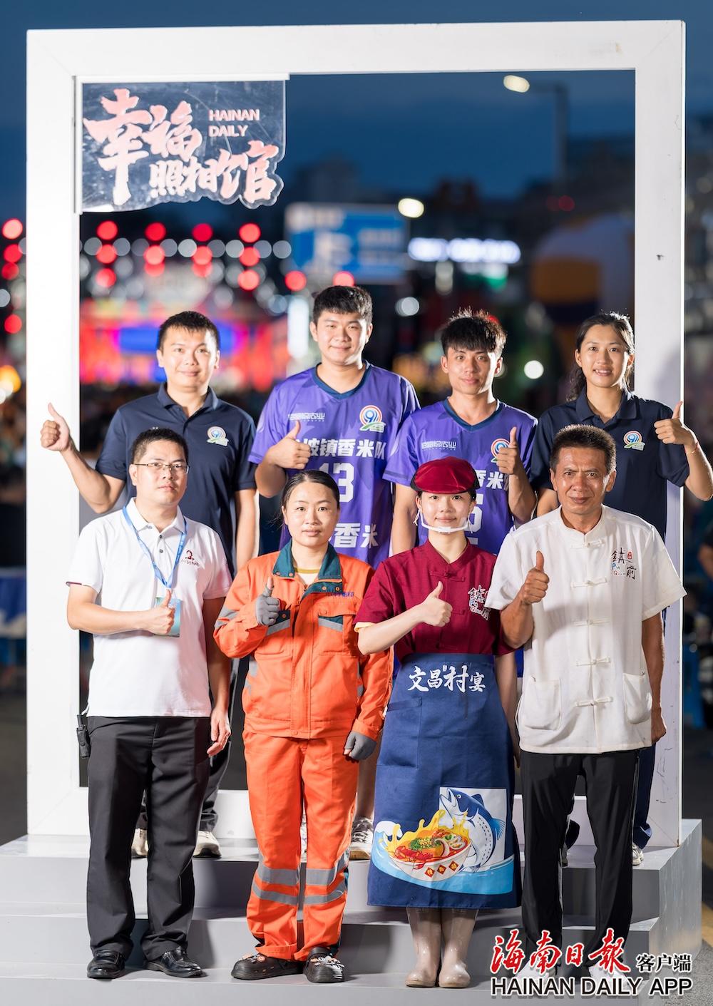 7月12日下午,海南日报报业集团“幸福照相馆”海南“村VA”专场活动在铺前镇举行。这是裁判员、教练员、参赛运动员、村宴制作团队、服务保障团队代表合影为海南“村VA”打call。