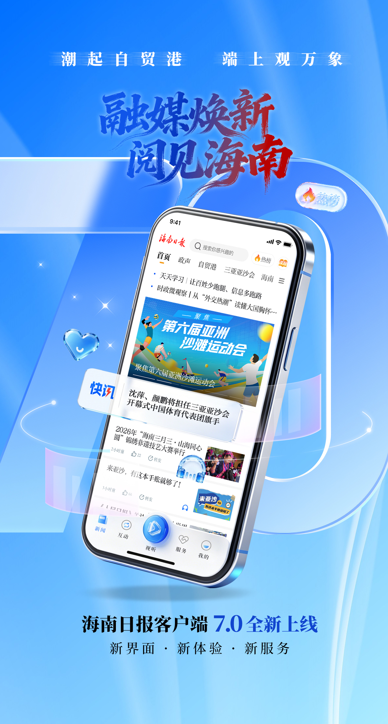 4月21日,海南日报报业集团旗舰主端——海南日报客户端7.0版本正式上线,此次版本更新以深入推进主流媒体系统性变革为牵引,聚焦技术赋能自主可控平台建设,标志着海南日报客户端向打造“资讯+社交+服务”的智媒服务平台迈出关键一步。